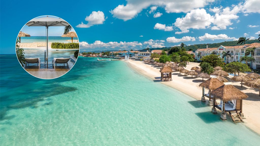 Sandals Royal Caribbean, located close to the airport in Montego Bay, is famous for its private offshore island with overwater bungalows and a small beach, giving you that “boat ride to your villa” experience without a long transfer.
